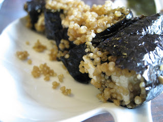 Innanzitutto cuocete a vapore il riso + 10cm di kombu. Nel frattempo fate cuocere anche la quinoa-seguite la ricetta sul retro della confezione-cioè fatela cuocere in acqua salata per circa una quindicinadi minuti-e quindi spegnete il fuoco ed aspettate per altri 10 minuti che si rapprenda; a questo punto, una volta che sia il riso che la quinoa sono cotti stendete il riso sul foglio di nori e quindi la quinoa sull’altro foglio. A questo punto aggiungete il tofu al naturale tagliato a listarelle e avvolgete il tutto a formare il classico tubo come avviene di solito nella preparazione del sushi. Ora tagliate a piccoli tocchettini i due tubi e, passate alla preparazione delle 2 salse d’accompagnamento.